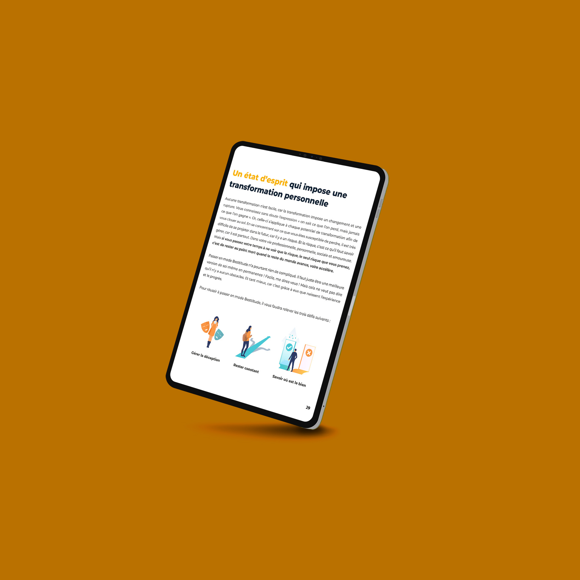 Concevoir l'intégralité du livre de manière à ce qu'il soit visuellement attractif et en accord avec la philosophie de la Besttitude. Chaque page se doit d’être un mélange harmonieux de contenu captivant et d'un design visuel soigneusement pensé.